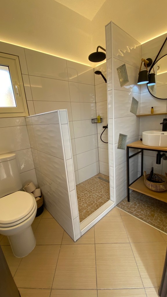 A l’étage, une chambre parentale mezzanine, avec lit double, chevets, douche, lavabo et placards.