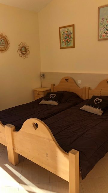 Dans le prolongement de la salle de séjour, une chambre avec 2 lits de 90, ouvrant sur une seconde terrasse vue piscine et montagne, chevets et grand placard, une salle de bains avec wc, lavabo et douche à l’italienne.